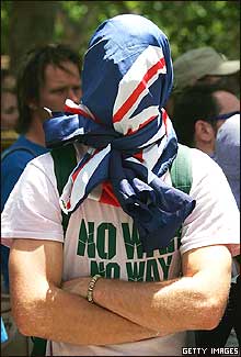 يک معترض استراليايی در مقابل شهرداری سيدنی صورت خود را با پرچم استراليا در راه پيمايی برای صلح پوشاند. بيش از هزار نفر در اين راه پيمايی که از شهرداری سيدنی تا پارک بلمور بود برای حمايت از صلح و مخالفت با نژاد پرستی شرکت کردند.