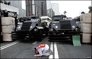 تظاهر کننده ای از کره جنوبی در مقابل سالن اجلاس وزرای سازمان جهانی تقاضای آزادی همکاران خود را از پليس می کند. اين تظاهرکنندگان، مخالفان و طرفداران تجارت آزاد هستند که با ماموران پليس درگير شدند.