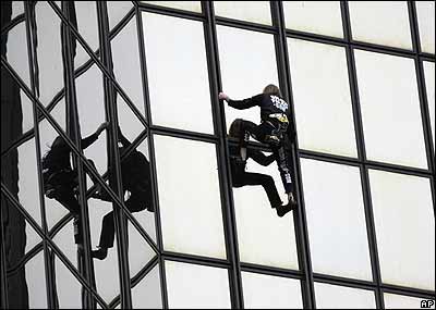 آلين رابرت، ۴۲ ساله معروف به مرد عنکبوتی فرانسه در حال بالا رفتن ازبرج ۲۸ طبقه کريستال در پاريس: رابرت معروف به بالارفتن از ساختمان های بلند بدون هيچ طناب يا وسيله ديگری است. او تا به حال از برج ايفل (فرانسه)، امپاير استيت بيلدينگ (نيويورک) و برج دوقلو پتروناس (مالزی) بالا رفته است.