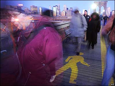 مردم شهر نيويورک در حال عبور از پل بروکلين. 34 هزار عضو اتحاديه حمل و نقل نيويورک پس از آنکه گفتگوها بر سر قرادادهايشان با کارفرمايان بی نتيجه ماند، دست به اعتصاب زدند.