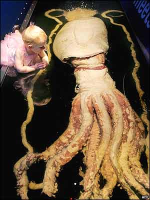 کودک سه ساله ای در حال ديدار با هشت پای غول پيکر در موزه ملبورن: اين هشت پای غول پيکر ۳۰۰ کيلوگرم وزن داشته و تا ۱۸ متر قد می کشد و تا عمق يک کيلومتر هم در زير دريا ميتواند زندگی کند. |