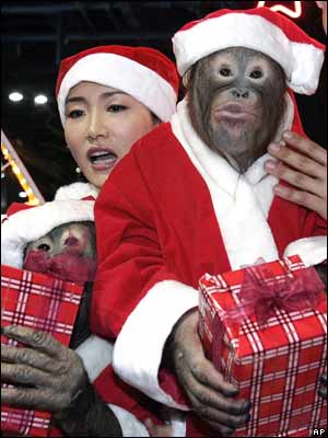 اورانگوتانی و مربی او در لباس بابانوئل در فروشگاهی در سئول هنگام کادو دادن به مردم به مناسب مراسم جشن کريسمس