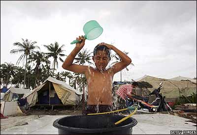 پسرک اندونزيايی در حال شست و شوی خود جلوی چادر محل سکونتش در آچه: دولت اندونزی اعلام کرد که همچنان 67 هزار و 500 بازمانده از سونامی در چادر زندگی می کنند.