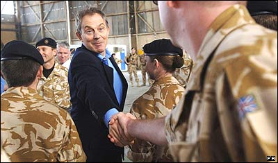 تونی بلر نخست وزير انگلستان با سربازان در پايگاه بصره ملاقات کرد.