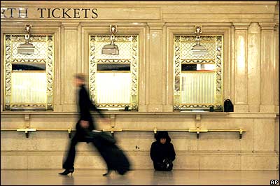 روز سوم اعتصاب ۳۴ هزار عضو اتحاديه حمل و نقل نيويورک، عابری از جلوی باجه بسته بليت فروشی مترو می گذرد در حالی که يک نفر زير باجه خوابيده است.