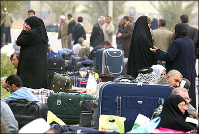 زائران مسلمان در خارج از مسجد القراء در بغداد منتظر اتوبوسی که آنها را به عربستان برای زيارت کعبه منتقل کند نشسته اند. اين زائران به خاطر اشتباه راننده اتوبوس و نداشتن مدارک کافی نتوانستند از مرز خارج شوند و دوباره به بغداد برگردانده شدند.