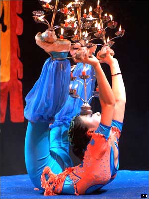 عضو چينی تبار يک سيرک در حال تمرين برای اجرای نمايش در سالن ملکه اليزابت در لندن که برای جشن کريسمس بدنش را به شکل لوستر کرده است.