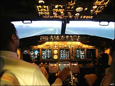 يکی از مربيان خلبانی هواپيمائی هندوستان در يک شبيه ساز پرواز برای بوئينگ ۷۳۷ در بمبئی: اين شبيه ساز در مرکز تمرينات خلبانی در غرب هند به مبلغ حدود ۱۳ ميليون دلار ساخته شده است.