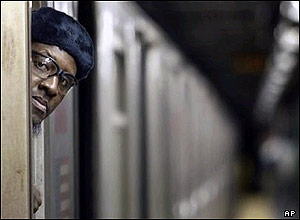 يکی از کارکنان شبکه متروی شهر نيويورک در حال نظاره جايگاه مسافران. شبکه حمل و نقل عمومی نيويورک پس از يک اعتصاب سه روزه از روز جمعه مجددا آغاز به کار کرد.
