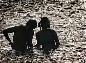 يک زوج جوان در حال آب تنی در آبهای مجاور ساحل پاتونگ، واقع در نزديکی جزيره پوکت در تايلند. پوکت يکی از جزايری بود که سال گذشته مورد يورش امواج ويرانگر سونامی قرار گرفت. دوستان و بستگان قربانيان فاجعه سونامی سال گذشته در شرق آسيا روز يکشنبه مراسم يادبودی را برگزار خواهند کرد.