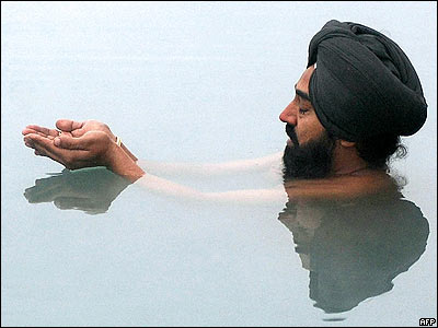 يکی از سيک های هند با وجود مه فراوان در منبع آبی در معبد طلايی آمريستار فرو می رود.