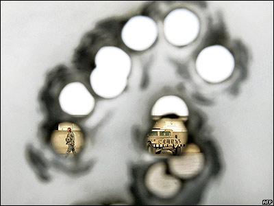 سرباز آمريکايی و اتومبيل ارتش از سوراخهای ايجاد شده توسط گلوله در اردوگاه پيروزی بغداد ديده می شوند. دونالد رامسفلد اعلام کرد که در سال آينده دو لشکر از نيروهای آمريکا را از خاک عراق باز می گرداند.
