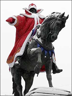 مجسمه يوری دولوگورکی بنيانگذار مسکو، با لباس بابانوئل: مسکو آماده برگزاری کریسمس ارتودوکس که در هفتم ژانويه است و جشن سال نو می شود.