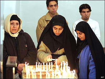 خانم هايی با پوشش اسلامی در حال روشن کردن شمع درکليسای سن گريگور تهران در روز کريسمس: از جمعيت 70 ميليونی ايران حدود 110 هزار نفر مسيحی هستند.