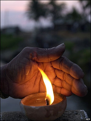 مرد سريلانکايی به یاد قربانيان سونامی در ساحل بنتوتا چراغی از روغن نارگيل روشن می کند.