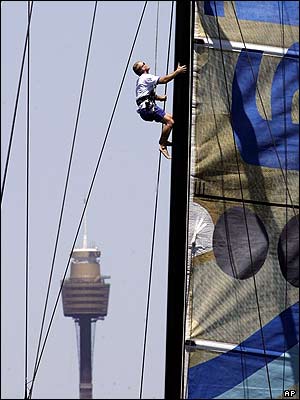مردی در حال تنظيم دکل بادبان اسکانديا قبل از مسابقات رالی قايق های بادی از سيدنی به هوبارت استراليا