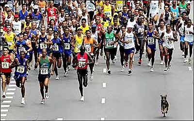 يک سگ ولگرد همراه با شرکت کنندگان مسابقه دو ماراتون در شهر سنت پائولو برزيل