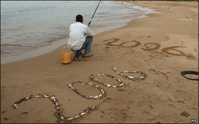 ماهيگيری در شهر سيدون لبنان، با ماهی های که به تور زده، پيام سال نو ميلادی را روی ساحل ترسيم کرده است