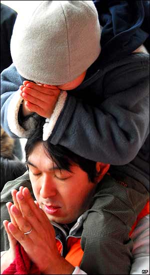 يک مرد ژاپنی و پسرش در حال عبادت در معبدی در شهر توکيوی ژاپن: حدود سه ميليون عبادت کننده از اماکن مقدس ژاپن، طی سه روز اول سال نو ديدن می کنند.