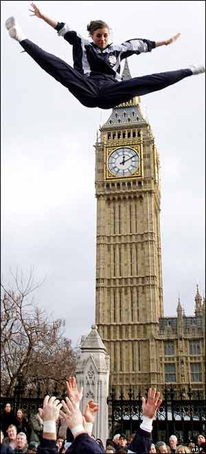 يک آکروبات آمريکايی در مراسم گراميداشت از سال نو در لندن در مقابل برج بيگ بن هنرنمايی می کند