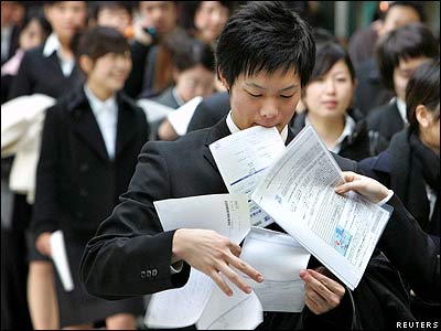 يک دانشجوی فارغ التحصيل ژاپنی در حال مرتب کردن نامه های دعوت به نمايشگاه مشاغل در توکيو. در اين نمايشگاه حدود 50 هزار تن از دانشجويانی که در پی يافتن شغلی پس از فارغ التحصيلی هستند، شرکت می کنند. در اين نمايشگاه بيش از هزار شرکت غرفه هايی برای معرفی مشاغل احتمالی به فارغ التحصيلان دائر می کنند.