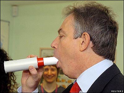 تونی بلر نخست وزير بريتانيا در حال آزمايش تنفس در جريان بازديد از يک مرکز بهداشتی در شمال لندن.