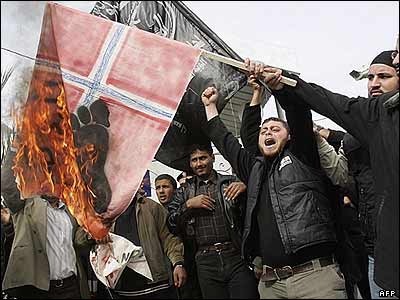 جمعی از جوانان فلسطينی جلوی دفتر اتحاديه اروپا در شهر غزه پرچم نروژ را به آتش کشيدند. اين تظاهرات در اعتراض به چاپ کاريکاتوری از پيامبر اسلام در يک روزنامه دانمارکی و هم در يک روزنامه نروژی برگزار شد.