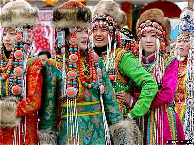 يک گروه از هنرمندان اقليت های قومی چين در حال اجرای مراسم جشن سال نو چينی در يکی از معابد شهر پکن.