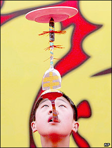 يک جوان چينی در حال اجرای تردستی های با بشقاب. اين برنامه امروز به مناسبت روز اول سال نو چينی در يکی از معابد شهر پکن اجرا شد. امسال، سال سگ است و مردم چين معمولا سال نو را با رفتن به معبد و ديدن دوستان و آتش بازی جشن می گيرند.