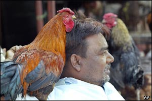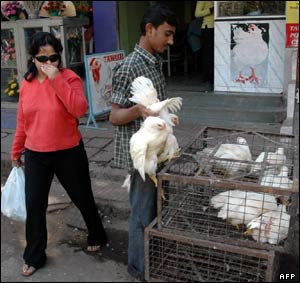 يک زن هندی در حاليکه جلوی دهانش را پوشانده است از کنار يک فروشنده مرغ در حيدر آباد عبور می کند. شيوع آنفولانزای مرغی نگرانی های زيادی را در جهان به دنبال داشته است.