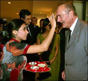 ژاک شيراک رئيس جمهور فرانسه، در هنگام ورود به محل اقامتش در دهلی نو: ترسيم خال قرمز رنگ بر روی پيشانی يکی از سنن هندوهاست. |