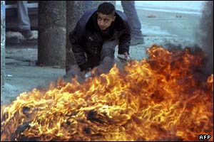 نوجوان فلسطينی خود را برای پرتاب سنگ به سوی سربازان اسرائيلی که در اردوگاه پناهندگان فلسطينی 'بالاتا' (در شهر نابلس) برای يافتن سلاح دست به تجسس زده اند، آماده می کند.