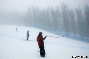 تعدادی از شرکت کنندگان و مسئولان پيست اسکی را قبل از انجام دور نهایی مسابقه زنان در المپيک زمستانی 2006 تورين ايتاليا بررسی می کنند.