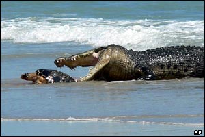 تمساح غول پيکری در استراليا به سمت لاک پشتی که سعی دارد خود را از دندانهای تيز او برهاند، حمله می کند.