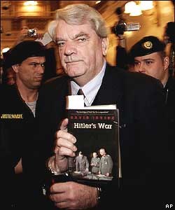 ديويد ايروينگ، تاريخ شناس بريتانيايی در حالی که کتابش با نام "جنگ هيتلر" را در دست دارد. آقای ايروينگ در جلسه محاکمه خود در وين، پايتخت اتريش، اتهام وارد به وی مبنی بر انکار واقعه کشتار يهوديان - هولوکاست - را پذيرفت.