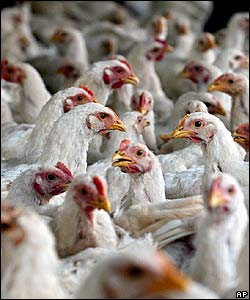مرغ ها در انتظار تغذيه شدن در يک دامداری در حومه اسلام آباد، پاکستان. گفته شده که روز دوشنبه دولت پاکستان برای جلوگيری از شيوع آنفلوآنزای مرغی، ورود گوشت مرغ از هند، ايران و فرانسه را ممنوع کرد.