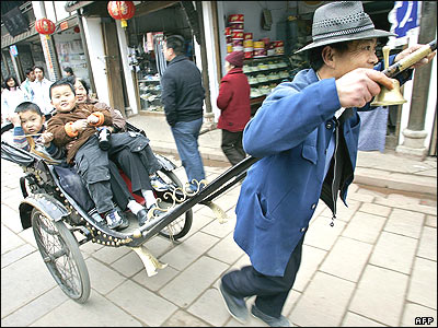 بچه های چينی در حال سواری روی درشکه های مخصوص که بجای اسب توسط انسان ها کشيده می شود.