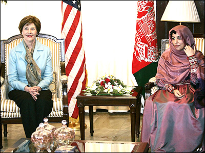 زينت کرزی، همسر حامد کرزی رييس جمهور افغانستان، در ديدار با لورا بوش، همسر جورج بوش رييس جمهور آمريکا. امروز آقای بوش سفر غيرمنتظره ای به افغانستان داشت.