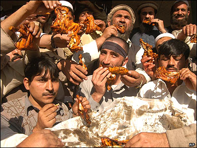 کاسبان پاکستانی که به خريد و فروش گوشت مرغ اشتغال دارند کباب مرغ می خورند . آنها به معدوم کردن هزاران مرغ در شمال اين کشور توسط مقامات حکومتی اعتراض کردند.