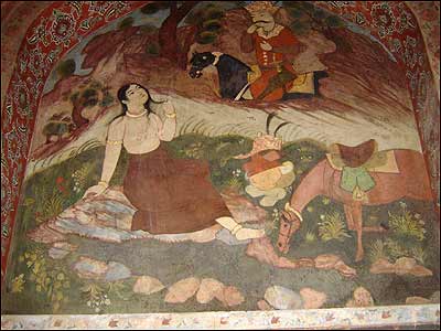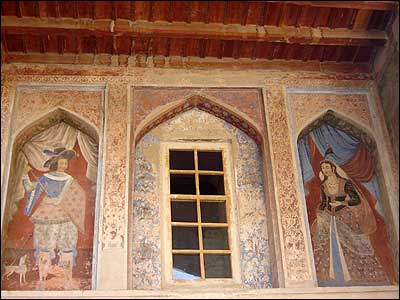 نقاشی های بزرگ را حتی بر ديوارهای ايوان های خروجی اطراف نيز می توان ديد. جالب آنکه اين نقاشی ها بعد از سالهای طولانی، هنوز سالم و زيبا باقی مانده اند. |