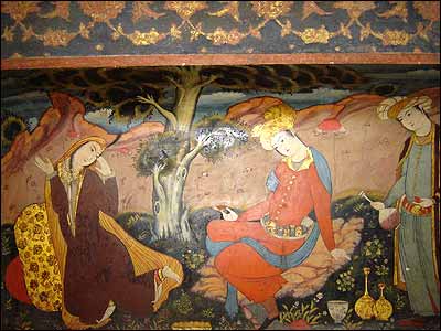 در اين عکس که از تالار گرفته شده است مطربان، رقاصه ها و ساقی به خوبی نمايان شده اند.