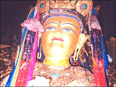 مجسه بودا در تبت که با زيورآلات تزيين شده است، سال 2001، تبت
