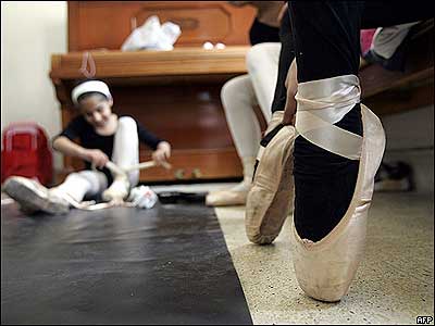 بالرين های عراقی در مدرسه موسيقی و باله بغداد، برای شرکت در کلاس آماده می شوند. اين بالرين های جوان، ممکن است رويای شهرت در سر داشته باشند، ولی در شرايط خشونت زده کنونی عراق، امکان ارائه چنين هنرهايی وجود ندارد.