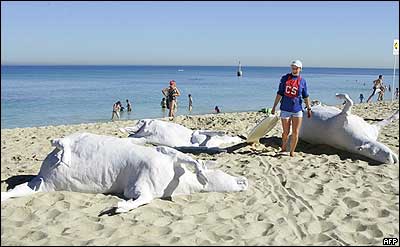 يک غريق نجات در نمايشگاه ساحلی از مجسمه های گاو که در ساحل شهر "پرت" برگزار شده است... اين تنديس ها کاری از "جف اوورها" مجسمه ساز استراليايی است.