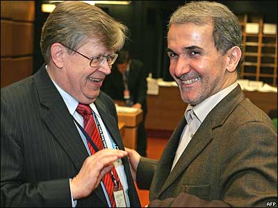 محمد مهدی آخوندزاده نماينده دائم ايران در دفتر سازمان ملل در وين در کنار معاون رييس آژانس بين المللی انرژی اتمی. شورای حکام آژانس روز چهارشنبه تصميم گرفت که پرونده اتمی ايران به شورای امنيت سازمان ملل متحد برود.