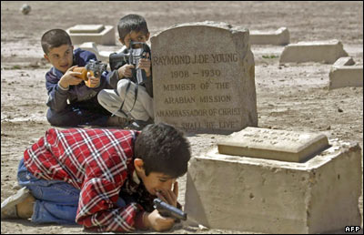 کودکان عراقی در يک قبرستان قديمی بريتانيايی مربوط به جنگ جهانی اول، در جنوب بصره در حال بازی هستند.