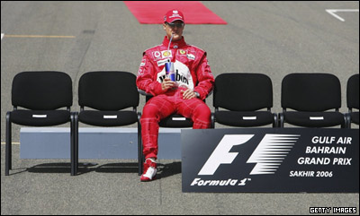 مايکل شوماخر، راننده آلمانی تيم فراری Ferrari، در انتظار گرفتن عکس قبل از اولين مسابقه فرمول 1 در بحرين. |