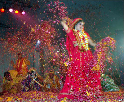 هنرمندی هندی با لباس سنتی در جشن مقدسی به نام جشن رنگها در هندوستان، گلبرگ به اطراف می پراکند.