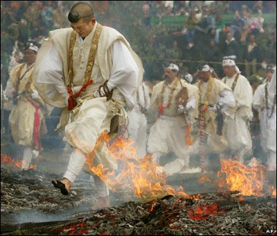راهبان و پيروان مکتب بودايی در مراسم تطهيری در شمال غرب توکيو شرکت کرده اند. يکی از قسمتهای اين مراسم مذهبی راه رفتن با پای برهنه بر روی آتش است.