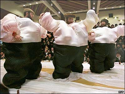 مردان ارتدوکس يهودی در حال رقص در مراسم جشن پوريم در نتانيا، شمال تل آويو. اين عيد، برای بزرگداشت رهايی يهوديان از حکم اعدام در ايران باستان است که روايت آن در کتاب "استر" آمده است.